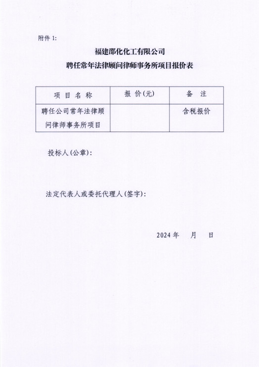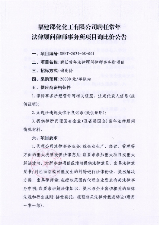 福建邵化化工有限公司聘任常年法律顧問律師事務所項目詢比價公告